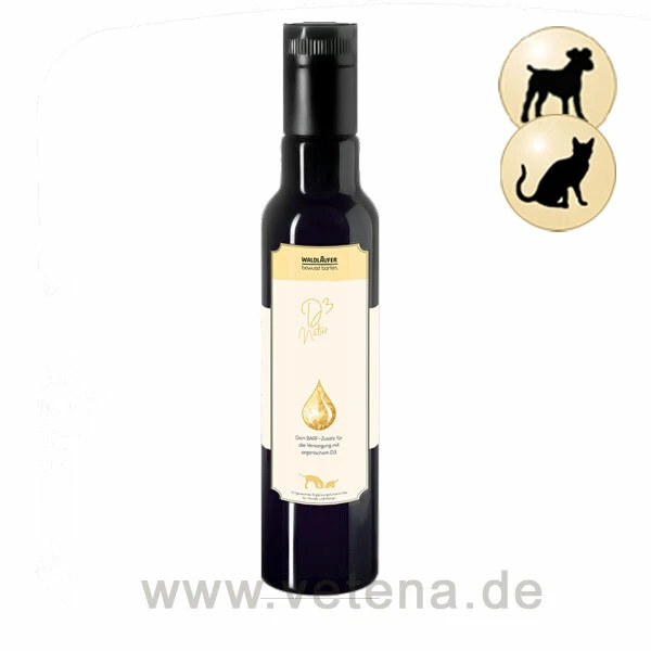 Die Waldläufer D3-Ölmischung vereint drei hochwertige, kaltgepresste Öle, die den Hund oder die Katze sowohl mit Vitamin D als auch mit essentiellen Fettsäuren versorgen:
